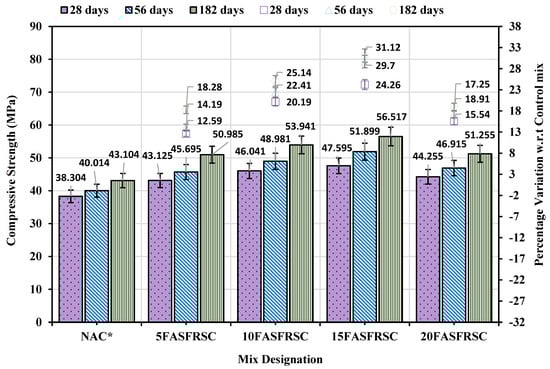 Concrete’s compressive strength at 28 days is commonly regarded as a benchmark in standard codes of practice for assessment. Past studies reveal that SCMs such as FA, SF, and R-Sand gain strength over time [,,,]. The published studies recommended evaluating the compressive strength at 28, 56, and 182 days. For this reason, in this study, the compressive was measured at 28, 56, and 182 days. In the mix, NAC*, containing 100% M-sand, was marked as a reference mix of the study. The newly prepared mixes 5FASFRSC, 10FASFRSC, 15FASFRSC, and 20FASFRSC, with varying percentages of (5–20% of fly ash), optimized (10% of silica fume), and 100% substitution of natural sand, were made with modified sand (50% R-sand + 50% M-sand), respectively.