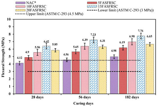 - At 28 days, the flexural strength of the 5FASFRSC, 10FASFRSC, 15FASFRSC, and 20FASFRSC formulations was found to be 16.3%, 18.5%, 21.4%, and 19.5% of the concrete’s design strength (f’c), respectively.