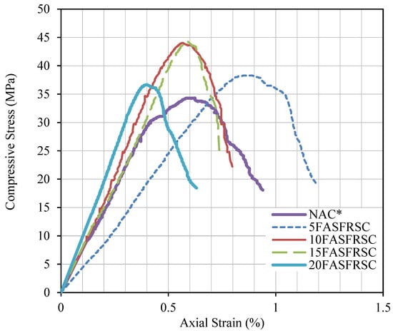 The stress-strain curves are presented in Figure 10. All specimens show almost the same initial slope, representing the elasticity modulus of concrete (Ec), except for 5FASFRSC. It is believed to be due to a testing glitch and not due to sample properties. The modulus of elasticity of the NAC* is about 27 GPa, which coincides with the value (4700 sqrt (fc’)) obtained by the American Concrete Institute (ACI) code of practice. The modulus of elasticity for 10FASFRSC 15FASFRSC is found from the graphs to be about 28.5 GPa, below the expected value of about 31.1 GPa according to the ACI formula. For 20FASFRSC, while the strength of the sample is lower than that of the 15FASFRSC sample, the modulus of elasticity is higher. It indicates a significant change in the mix’s properties and diverges from the ACI equation’s predictions regarding the modulus of elasticity. Considering the failure strain, excluding sample 5FASFRSC due to the testing issue, and sample 20FASFRSC, which shows a low failure strain, all three other specimens showed a typical failure strain of 0.16%. However, all samples have different failure strain values, which are reported to be close to acceptable limits.