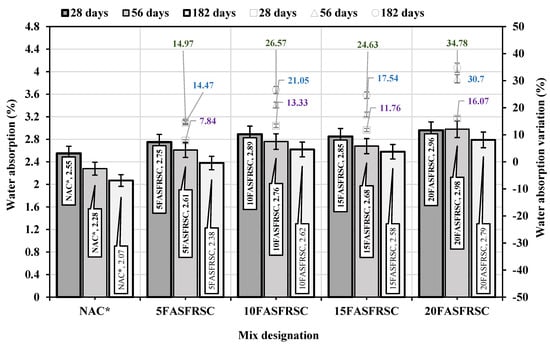 In the mixes labeled NAC*, 5FASFRSC, 10FASFRSC, 15FASFRSC, and 20FASFRSC, water absorption rates were measured after 28 days of curing, showing values of 2.55%, 2.75%, 2.89%, 2.85%, and 2.96%, respectively. At the 56 days, these rates were recorded as 2.28%, 2.61%, 2.76%, 2.68%, and 2.98%, respectively. Additionally, at 182 days of curing, the water absorption percentages were 2.07%, 2.38%, 2.62%, 2.58%, and 2.79%. The trend observed indicates that as the curing period extended, there was a noticeable reduction in water absorption levels. The reactive silica found in FA and SF interacts with the byproducts of hydration produced by OPC, forming additional CSH gel at later curing stages, resulting in a denser concrete matrix, which inhibits further water absorption. The pozzolanic activity of microsilica contributes to blocking the pores in the concrete, and by filling these pores, it reduces their size, making it more difficult for water to penetrate, thereby decreasing water absorption and improving durability. The findings of this study align with those reported in recent publications [,,,].