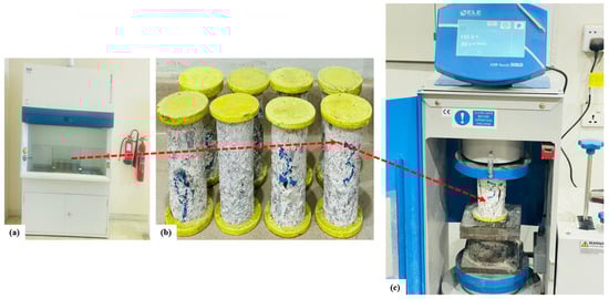 The sulfuric acid resistance was evaluated by measuring the mass loss after immersion in a H2SO4 solution for 28, 56, 91, and 182 days. The time interval for mass loss was extended as the mass loss values differed slightly. Four mass loss observation intervals were taken to determine the actual results. The residual compressive strength of the developed mixes was assessed in the same manner as the compressive strength for standard curing periods of 28, 56, and 182 days following immersion in a 5% H2SO4 solution. This approach ensured consistency in the results and allowed for comparison with compressive strength under normal conditions. Following 28 days of standard curing, the specimens were extracted. The original mass of each sample was calculated at a saturated surface dry (SSD) state after 28 days of normal curing. Each mix produced three concrete cylinders, measuring 75 mm in diameter and 150 mm in height, which were placed in a 5% H2SO4 solution for submersion. Figure 12a shows the sample in the container with 5% sulfuric acid solution in an incubator. The samples were taken out after completing the immersion time and exposure to room temperature until they reached the saturated surface dry (SSD) state shown in Figure 12b. Finally, Figure 12c shows the samples under compressive strength testing.