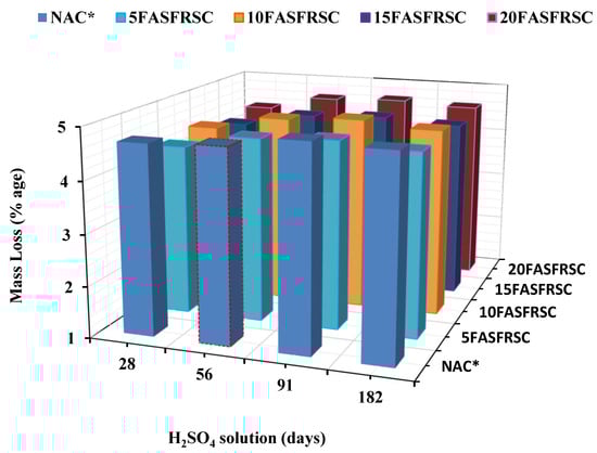 The present study is based on newly developed concrete, so the direct comparison is invalid. However, the present study’s findings closely match the published study’s []. In the study [], 10% SF was partially replaced by OPC in the concrete mix design and immersed in a 5% sulfuric acid solution. A mass loss of around 5% was discovered, as in our study of developed mixes 5FASFRSC, 10FASFRSC, 15FASFRSC, and 20FASFRSC, respectively.