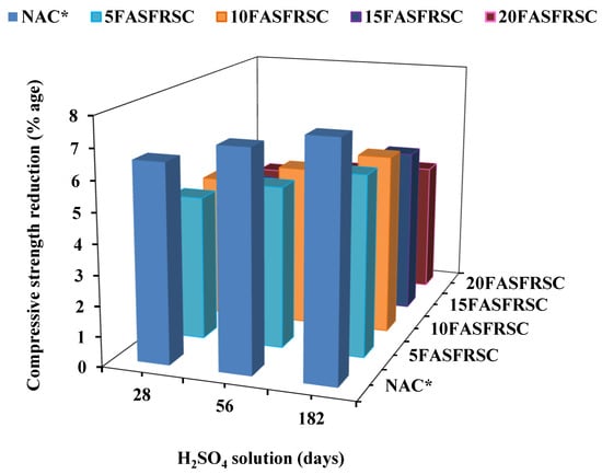 Samples were taken out to perform a compressive strength test after being incubated for 28, 56, and 182 days in a 5% sulfuric acid solution. The mean value derived from three identical specimens was used to assess the decrease in compressive strength for each formulated mix. Figure 14 illustrates the percentage decrease in compressive strength following 28, 56, and 182 days of exposure to 5% sulfuric acid. Figure 14 showcases the graphs for the NAC* mixes labeled as 5FASFRSC, 10FASFRSC, 15FASFRSC, and 20FASFRSC, respectively. Over 28, 56, and 182 days, the reference mix NAC* experienced a reduction in compressive strength by 6.55%, 7.2%, and 7.69%, respectively. The percentage reduction of compressive strength in the mixes 5FASFRSC, 10FASFRSC, 15FASFRSC, and 20FASFRSC at 28, 56, and 182 days was found (4.79, 5.37, and 5.99%), (4.09, 4.67, and 5.54%), (3.34, 3.88, and 4.4%) and (3.95, 4.23, and 4.44%), respectively. When 10% of OPC is substituted with SF and varying amounts of FA (ranging from 5% to 20%) in the mixes 5FASFRSC, 10FASFRSC, 15FASFRSC, and 20FASFRSC, the decrease in compressive strength is less pronounced compared to the reference mix NAC*.