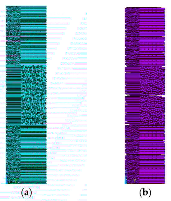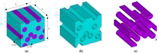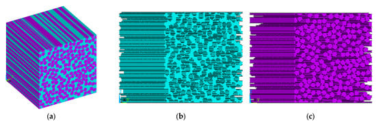 Based on the fiber coordinates and radii generated in MATLAB (R2023a), FEM modeling is performed using ANSYS APDL (2022 R2, ANSYS, Inc., Canonsburg, PA, USA). The fiber material is modeled as glass, with a Young’s modulus of 73.1 GPa and a Poisson’s ratio of 0.22, while the matrix material is epoxy, with a Young’s modulus of 3.45 GPa and a Poisson’s ratio of 0.35. A uniform voxel-based mesh is created using eight-node brick elements, initially assigning matrix properties to all elements. Based on the known coordinates and radii of all fibers, each voxel is then reassigned either the fiber or matrix material property depending on its location. A 2D view of the meshed RVE before and after fiber material assignment is shown in Figure 3, and the 3D view is presented in Figure 4.