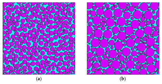Examples of RVEs with randomly distributed fibers of varying radii: (a) 65% fiber volume fraction, (b) 73% fiber volume fraction.