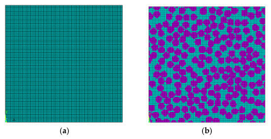 Meshed RVE: (a) before material assignment, (b) after assigning fiber and matrix material properties.