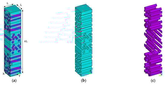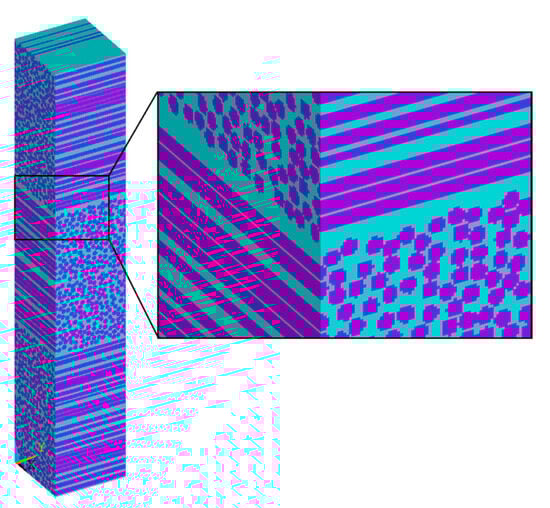The overall laminate was assembled by stacking the generated layers together, forming a composite structure with dimensions of 100 × 100 × 600 units. This approach to constructing a laminate by stacking distinct layers was previously adopted by Song et al. []. The resulting RVE and its coordinate system are shown in Figure 5.
