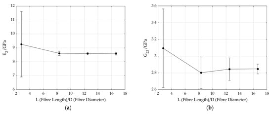 In contrast, the Reuss model assumes uniform stress across the fiber, matrix, and composite []. Under this assumption, the transverse elastic modulus (E2), the in-plane shear modulus (G12), and the out-of-plane shear modulus (G23) are given by Equations (22)–(24) [].
