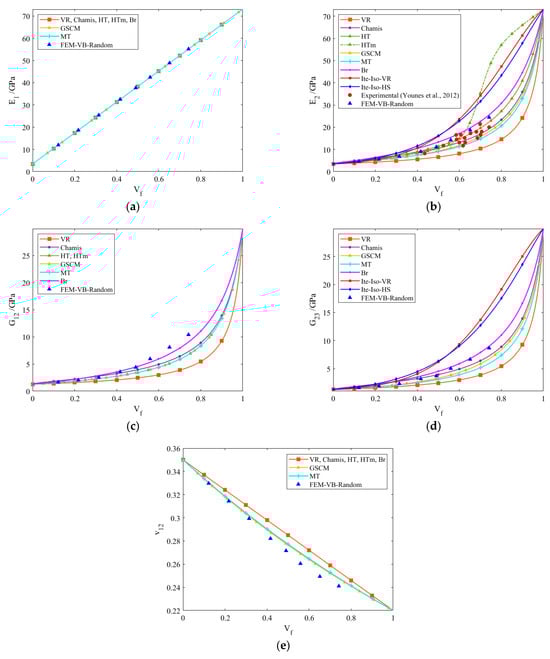 In addition to Voigt–Reuss and its modifications, the Generalized Self-Consistent model [,], Mori–Tanaka model [], and Bridging Model [,] are also widely applied in composite material analysis. The Generalized Self-Consistent model was initially proposed by Hashin and Rosen [] and extended by Hashin [] and Christensen and Lo []. Mori and Tanaka [] developed a method that was reformulated by Benveniste [] and closed-form expressions provided later by Abaimov et al. []. The Bridging Model introduces two empirical parameters to account for fiber packing geometry, and Wang and Huang [] recommended a value that provided the most accurate overall results after investigating 18 composites.