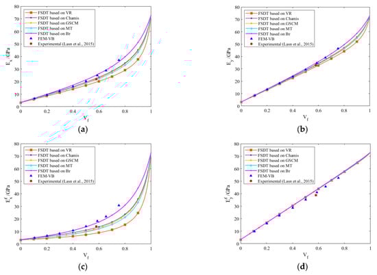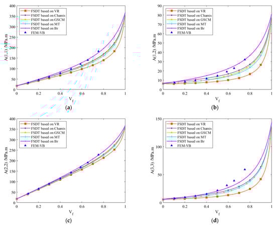 Figure 13 shows the non-zero and independent elements of the in-plane matrix (A) as predicted by FSDT using the selected micromechanics models, alongside the corresponding VB-FEM results.