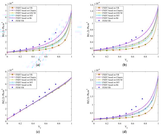Non-zero and independent elements of the bending stiffness matrix (D) predicted by selected micromechanics models and VB-FEM: (a) D(1,1), (b) D(1,2), (c) D(2,2), and (d) D(3,3).