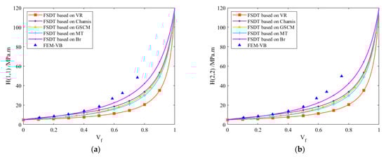 Non-zero elements of the transverse shear stiffness matrix (H) predicted by selected micromechanics models and VB-FEM: (a) H(1,1) and (b) H(2,2).