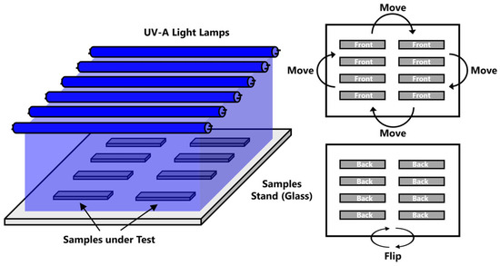 Diagram of the UV aging chamber (left side) and approach followed for positioning and flipping of the samples (right side).