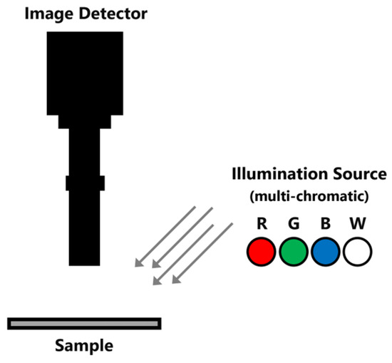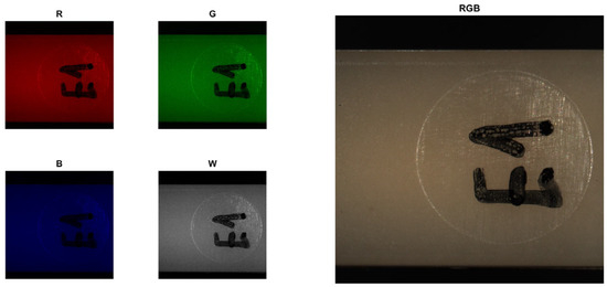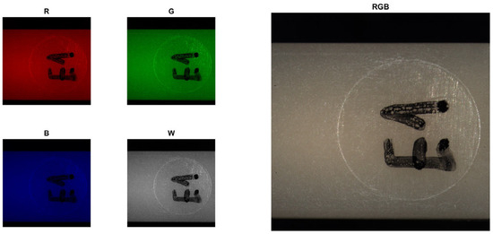 Images of the PLA + MC and PP + MC specimens were acquired using a customized optical system with multi-chromatic LED lighting. A diagram of the used optical system is shown in Figure 2, displaying its main components: namely, an image detector Alvium 1800 U-2040m from Allied Vision (Stadtroda, Germany), a controlled illumination source composed of an LED lamp Parathom Pro from OSRAM (Augsburg, Germany), and a motorized wheel filter USFW-100 from Newport (CA, USA). This system captures a sequence of images by illuminating the sample with red (630 nm), green (530 nm), blue (460 nm) monochromatic light, and white (400–780 nm) polychromatic light.
