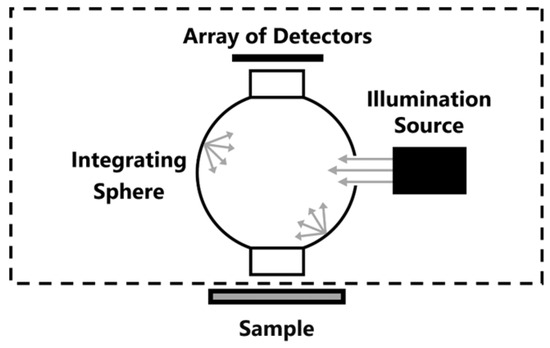 Throughout the entire duration of the UV accelerated aging test, spectral reflectance and colorimetric measurements in the color space CIE 1976 L*a*b*, ISO/CIE 11664-4 [43] were conducted on the tested specimens. These measurements were used to track any potential changes on the specimens from the beginning of the test to its conclusion. L* denotes lightness, whereas a* and b* denote color coordinates (a* is related with the opponent colors red–green; b* is related with the opponent colors blue-yellow). For this part of the experiment, a spectrophotometer, model Chroma Sensor CS-5, and the corresponding white calibration standard from Datacolor International (Zurich, Switzerland) were used. A simplified diagram of the equipment is shown in Figure 3, displaying its main components. Namely, an illumination source emits light to an integrating sphere that will then pass through two openings: one where the sample is placed and the other which is connected to an array of detectors. All the light collected by the sphere is ultimately decomposed into several spectral bands (400 to 780 nm with a 10 nm step), allowing the measurement of the spectral reflectance distribution of the samples, as well as the corresponding colorimetric data, expressed in the CIE 1976 L*a*b* color space, using the standard illuminant D65 [44] for a standard observer of 2°.