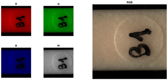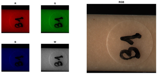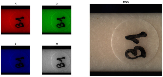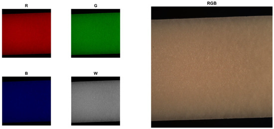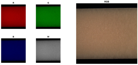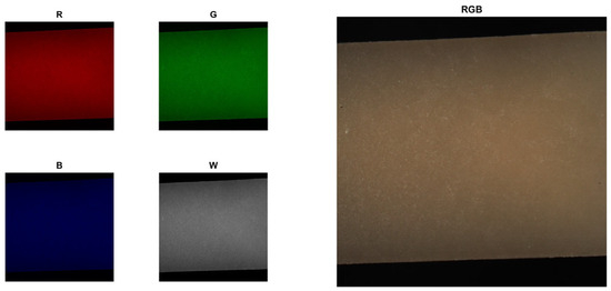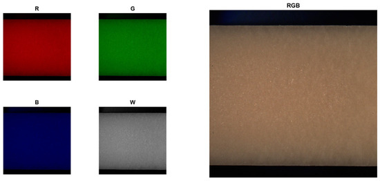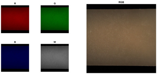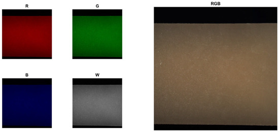Images of the specimens of PLA + MC and PP + MC that were stored in the dark (original specimens), as well as those exposed to UV radiation, were captured using the optical system described in Section 2.3. Figure 4, Figure 5, Figure 6, Figure 7, Figure 8, Figure 9, Figure 10, Figure 11, Figure 12, Figure 13, Figure 14 and Figure 15 show the images obtained throughout the entire test period (10 weeks). The left side of the figures shows the images of the individual components of the samples (R—red, G—green, B—blue, and W—white), while the right side shows the corresponding full color images (RGB), resulting from the combination of the different individual components.