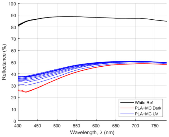 Spectral reflectance measurements in the visible spectrum for the specimens of PLA + MC as well as for the white calibration standard (white reference) during the 10 weeks of the UV accelerated aging test (the full results are shown in Table A1 and Table A2 of Appendix A).