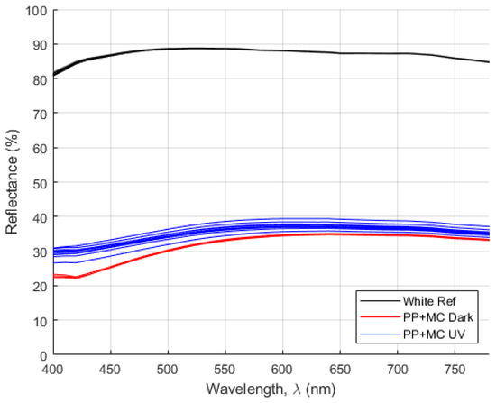 Spectral reflectance measurements in the visible spectrum for the specimens of PP + MC as well as for the white calibration standard (white reference) during the 10 weeks of the UV accelerated aging test (the full results are shown in Table A1 and Table A3 of Appendix A).