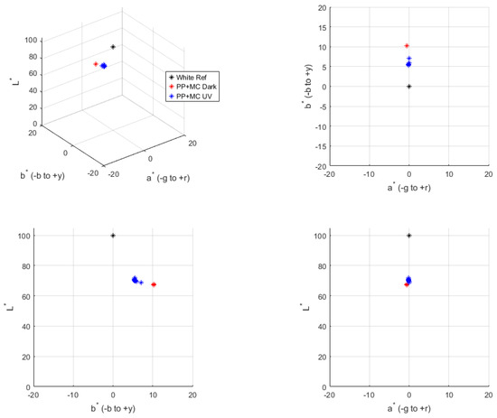 Colorimetric representations in the CIE 1976 L*a*b* color space [43] for the specimens of PP + MC as well as for the white calibration standard (white reference) during the 10 weeks of the UV accelerated aging test (the full results are shown in Table A5 of Appendix A).
