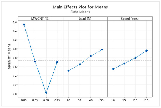 Figure 1 shows the main effects plot for the mean WR, illustrating the influence of MWCNT content, applied load, and sliding speed. The WR decreased sharply with increasing MWCNT content up to 0.5 wt%, indicating enhanced wear resistance due to effective load transfer and matrix reinforcement by well dispersed MWCNTs. A slight increase in WR was observed at 0.75 wt%, likely due to agglomeration-induced stress concentration. As expected, WR increased steadily with rising load and speed, reflecting higher contact stress and thermal effects during sliding.
