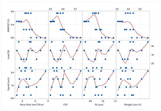 The Load shows a generally direct relationship with WR and WL, indicating that higher applied loads promote more material removal and increased weight loss. For COF and Ra, the trends with Load are less consistent, reflecting a more complex interaction between contact stress and surface roughness evolution during sliding. Speed demonstrates a moderate influence, where lower speeds tend to favor lower WR, COF, Ra, and WL values. However, the trends for Speed are not as pronounced as for MWCNT content and Load, suggesting a secondary role in the tribological behavior within the selected range. Overall, the matrix plots validate the findings from the Taguchi analysis and ANOVA, reaffirming that MWCNT content is the most influential parameter, followed by Load, with Speed having the least effect.