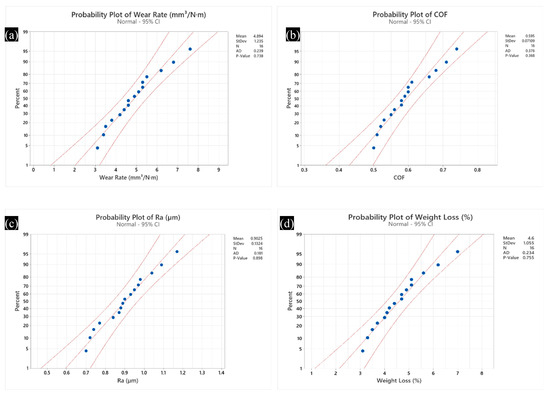 Probability plots: (a) Wear rate; (b) COF; (c) Ra; (d) Weight loss.