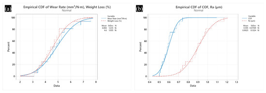 Empirical CDF: (a) Wear rate and weight loss; (b) COF and Ra.