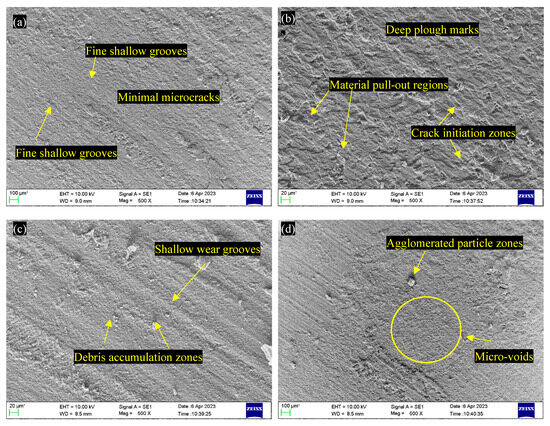 The SEM micrographs of the worn surfaces corresponding to different MWCNT loadings and testing conditions are presented in Figure 6a–d. These images provide critical insights into the wear mechanisms governing the tribological behavior of bio-based epoxy/MWCNT composites, complementing the Taguchi and ANOVA analyses discussed earlier. Figure 6a depicts the worn surface of the composite containing 0.5 wt% MWCNT, tested under 30 N load and 1.0 m/s sliding speed, which exhibited the lowest WR and WL. The surface is relatively smooth with shallow grooves and minimal microcracking, suggesting that the presence of optimally dispersed MWCNTs effectively reinforced the matrix, enhanced load transfer, and resisted surface degradation during sliding. This observation aligns with the Taguchi and ANOVA results, where 0.5 wt% MWCNT content showed the highest contribution towards minimizing WR, COF, Ra, and WL.