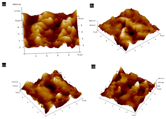 AFM 3D surface topographies of worn composite pins: (a) 0.5 wt% MWCNT, 30 N, 1.0 m/s (smoothest surface—optimal); (b) 0 wt% MWCNT, 50 N, 2.5 m/s (severe wear—highest Ra); (c) 0.25 wt% MWCNT, 40 N, 2.5 m/s (moderate roughness); (d) 0.75 wt% MWCNT, 20 N, 2.5 m/s (rough surface due to agglomeration).
