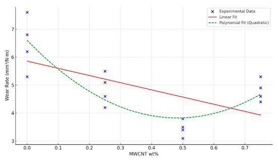 To understand the influence of MWCNT reinforcement on the wear performance of bio-based epoxy composites, linear and polynomial regression models were developed using the experimental data obtained from the Taguchi-designed wear tests. Linear regression was first applied to model the wear rate (WR) as a direct function of MWCNT weight percentage in Equation (1):