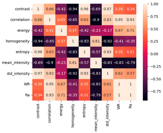 To further elucidate the role of individual image-based features on wear behavior, Figure 11a–h present a set of high-resolution scatter plots comparing selected texture descriptors with wear rate (WR) and surface roughness (Ra). These descriptors were extracted from grayscale SEM and AFM images using gray-level co-occurrence matrix (GLCM) analysis and pixel intensity statistics. Each plot visualizes the behavior of one image feature in relation to WR or Ra, helping isolate its contribution and physical interpretation. Figure 11a presents the relationship between average grayscale intensity and surface roughness (Ra). A clear inverse trend is observed, indicating that brighter (higher mean intensity) surface regions, often associated with smoother or polished wear zones, correspond to lower roughness values. This highlights the utility of mean intensity as a quick image-derived proxy for surface finish evaluation.