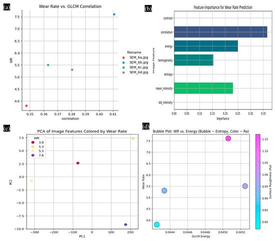 (a) Linear relationship between GLCM correlation and wear rate (WR); (b) Feature importance ranking from Random Forest Regressor; (c) PCA scatter plot of image feature distribution colored by WR; (d) Bubble plot showing WR vs. GLCM energy, where bubble size denotes entropy and color represents surface roughness (Ra).