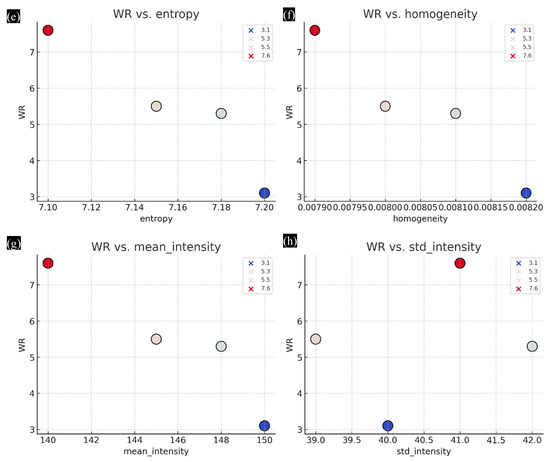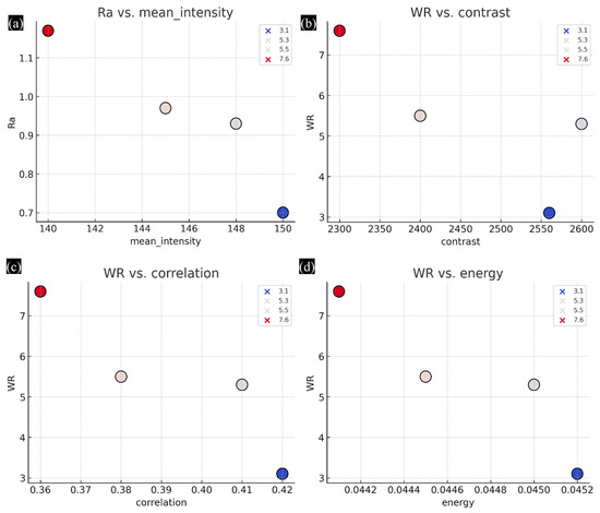 In Figure 11b, the scatter plot of WR vs. contrast reveals a non-monotonic trend. Higher contrast values typically represent more distinct surface features and sharp wear scars. Samples with moderate contrast tend to show increased WR, possibly due to micro-abrasive damage, whereas extreme contrast values may reflect smoother or delaminated zones with reduced wear. Figure 11c explores the strong inverse correlation between WR and GLCM correlation. As correlation increases, suggesting more uniform and directionally consistent textures, WR tends to decrease. This reinforces the observation that aligned surface features are associated with lower resistance to abrasive forces and thus higher WR.