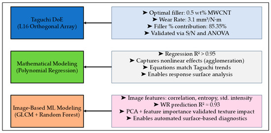 This study employed a three-tiered approach to understand and predict the wear performance of bio-based epoxy composites reinforced with MWCNTs: (i) Taguchi experimental design with statistical validation, (ii) empirical regression-based mathematical modeling, and (iii) image processing and machine learning-based feature correlation and prediction.