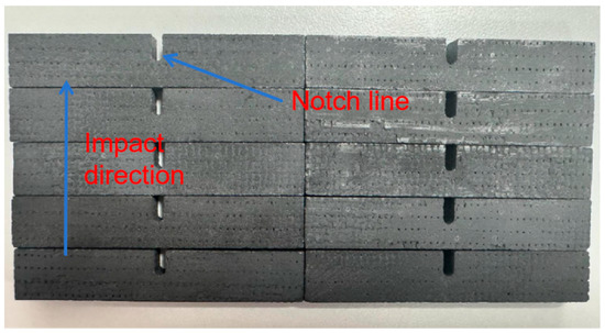 Preparation of SiC/SiC composite flat plate: The SiC fibers used in this work were purchased from Xiamen Torch Company, with a tensile strength of 3.2 GPa and a tensile modulus of 310 GPa. The 2.5D preform is woven from 90° fiber bundles in the weft direction and 0° fiber bundles in the warp direction and needle-punched fiber bundles. A BN interface (with a thickness of approximately 500 nm) was deposited via Chemical Vapor Infiltration (CVI), and then an SiC matrix was prepared through multiple CVI processes. Finally, a composite plate with a density of 2.35 g/cm3 and a porosity of 21.2% was obtained. Reparation of U-notched sample: The composite sheet was cut into samples with a size of 55 mm × 10 mm × 5 mm, and then the samples were U-notched with a notch depth of 5 mm and a radius of curvature at the bottom of 1 m. After processing, the SiC coating was then prepared by Chemical Vapor Deposition (CVD) to obtain the final sample, as shown in Figure 1.