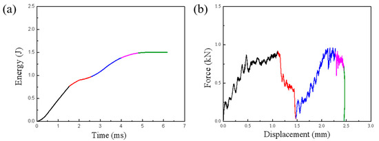 Figure 2 shows the impact curve of SiC/SiC—one sample after it was subjected to 1.5 J of impact energy. As shown in Figure 2a, according to the conventional three-stage curve, the energy–time curve of the sample can also be divided into a quasi-linear elastic region (black, blue), a severe load drop region (pink), and a rebound stage after the peak impact energy (green). However, different from the conventional three-stage law, there is a plateau stage (red) in the impact energy around 1 J. This stage is similar to the stage with a severe drop in load and the displacement rebound stage after the impact energy exceeds the peak. After this stage, the conventional three-stage curve reappears. Figure 2b shows the displacement–load curve for this sample, which is preceded by a near-linear stage (black in Figure 2b) corresponding to the quasi-linear elastic region of the energy–time curve, followed by a plateau stage (red in Figure 2b). After that, the conventional three-stage curve reappears. It is hypothesized that irreversible deformation of the sample occurs during the plateau stage, and that during the plateau stage and rebound stage, after the peak impact energy, some of the deformation of the sample is restored to give the falling hammer a force in the opposite direction of the impact to make the hammer rebound, and then the sample releases some of the impact energy. The energy at the end of the displacement rebound phase is the energy that is ultimately absorbed by the sample.
