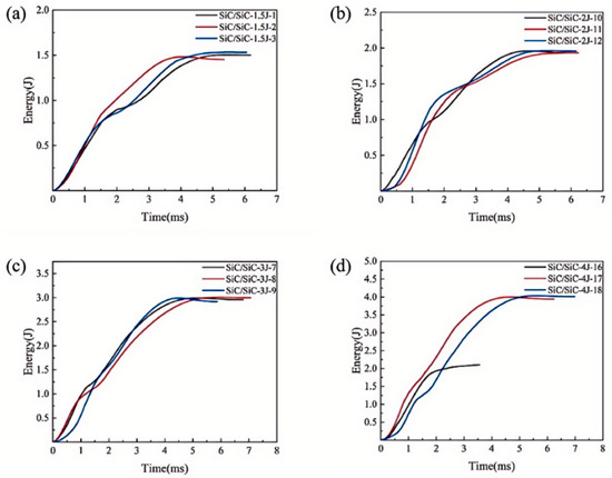 Energy–time curve of samples at different impact energies: (a) 1.5 J, (b) 2 J, (c) 3 J, and (d) 4 J.