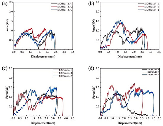 Displacement–load curve of samples at different impact energies: (a) 1.5 J, (b) 2 J, (c) 3 J, and (d) 4 J.