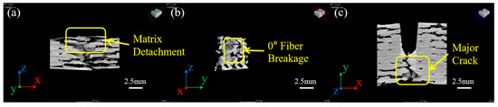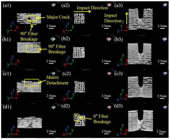 Figure 5 shows the CT scanning results in the vicinity of damage for some unbroken samples after impact. These samples were fractured by the impact of the main crack along the Y-direction, in addition to the non-negligible damage seen in the X- and Z-directions. From Figure 5(a3,b3,c3,d3), in the XY plane view, it can be seen that the most damaged area is the area where the sample first made contact with the falling hammer. Since the impact direction is perpendicular to the weft direction, it can be seen in Figure 5(a1) that the breakage of the fiber bundle at 90° in the weft direction already occurs at an impact energy of 1.5 J. Combined with the plateau stage in the energy–time curve mentioned above, with the plateau stage occurring at about 1 J of impact energy, we can conclude that the reason for the plateau stage is the breakage of the fiber bundle at 90° in the weft direction. Compared with Figure 5(b1,c1,d1), with the increase in impact energy, the breakage of 90° fibers in the weft direction increases significantly, the crack extension paths of the samples become longer, and the matrix shedding phenomenon and the breakage of 0° fibers in the warp direction appear in the samples with the impact energies of 3 and 4 J. The above phenomena show that although the four samples did not break under the four impact energies, there are differences in their energy absorption mode. All four energies can penetrate the 90° fibers, but the impact energies of 1.5 J and 2 J cannot penetrate the 0° fibers, while the impact energies of 3 J and 4 J can penetrate the 0° fibers and cause the matrix to break and fall off.