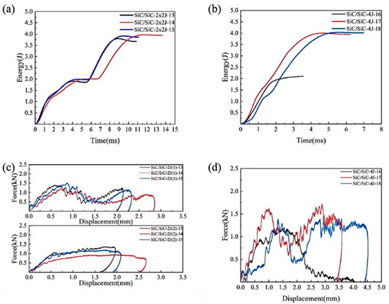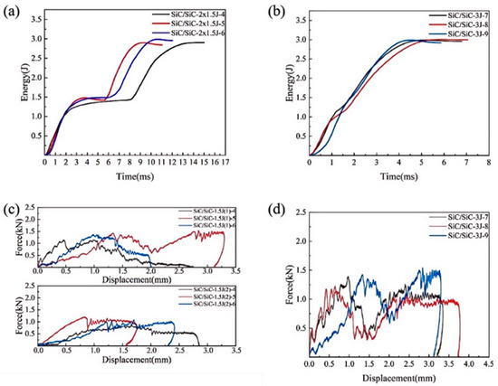 Energy–time curve and displacement–load curve of 2.5D SiC/SiC samples at different impact times with total energy of 4 J. Energy–time curve: (a) 2 × 2 J and (b) 4 J; displacement–load curve: (c) 2 × 2 J and (d) 4 J.