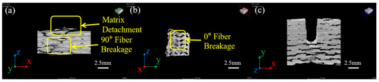 CT scan results of 2.5D SiC/SiC samples after two impacts of 2 J each: (a) XZ plane, (b) YZ plane, and (c) XY plane.