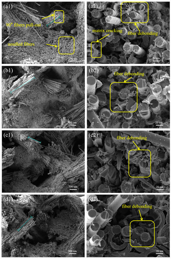Figure 10 shows the fracture morphology of the near U-port region of samples No. 4, 9, 13, and 16, from which it can be seen that there is an obvious brittle fracture and pullout of the 90° fibers, as well as a fracture of the matrix and debonding of the 90° needled fibers connecting the fibers and the matrix, enhancing the interfacial bonding force between the fibers and the matrix. A comparison of 2 × 1.5 J Figure 10(a2) and 2 × 2 J Figure 10(b2), along with 3 J Figure 10(c2) and 4 J Figure 10(d2), shows that the fracture and debonding of the 90° fibers are more severe with increasing impact energies. Also comparing the fiber debonding in Figure 10(a1) for 2 × 1.5 J and Figure 10(c1) for 3 J, along with Figure 10(b1) for 2 × 2 J and Figure 10(d1) for 4 J, it can be observed that under conditions with the same total impact energy, the fiber debonding becomes more severe as the number of impacts increases. This indicates that during the impact process, the internal damage of the composite material continues to accumulate, and the structural integrity is gradually destroyed. By comparing the fiber pull-out lengths in Figure 10(c1) for 3 J and Figure 10(d1) for 4 J, along with Figure 10(a1) for 2 × 1.5 J and Figure 10(b1) for 2 × 2 J, it can be observed that the fiber pull-out length increases with the increase in impact energy. This indicates that the friction between the fibers and the matrix increases during the impact process, thereby consuming more energy, which also demonstrates that fibers play a good reinforcing role in the composite material. Meanwhile, by comparing the fiber pull-out lengths in Figure 10(a1) for 2 × 1.5 J and Figure 10(c1) for 3 J, along with Figure 10(b1) for 2 × 2 J and Figure 10(d1) for 4 J, it was found that under conditions with the same total impact energy, the fiber length also increases with the increase in the number of impacts. This phenomenon suggests that during fiber fracture and pull-out under multiple impacts, more resistance needs to be overcome, which is consistent with the aforementioned conclusion that multiple impacts cause greater damage to the composite material.