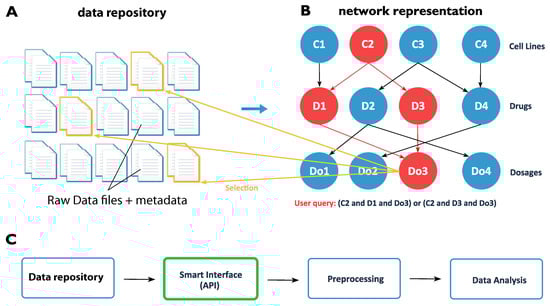 In Figure 1, we show a visualization of our idea. A smart interface exploits the connectivity structure among the raw data files (see Figure 1A), which can also include metadata if available, by generating a network representation among the individual data files (see Figure 1B). In the example of the LINCS database, these connections are given by the combination of cell lines, drugs, dosages of drugs, etc. for which gene expression profiles have been generated. In general, these correspond to the attributes of the data files. Importantly, these attributes remain constant and do not change if more data points are added to a database. Once such a network representation among the data files is generated, a user query extracts quickly the desired data files, e.g., that correspond to cell line C2, the drugs D1 and D3 and the dosage Do3 (see Figure 1B and its connection back shown in yellow to the data files), because each search combination connects to a list of associated data files. In this way, a smart interface forms a connection between the data repository and the preprocessing and analysis of the data (see Figure 1C) and its purpose is to provide a graphical-user-interface and query function for an efficient access to selected data files. We want to emphasize that the network representation should be part of the smart interface because, in this way, it would be easily applicable for practitioners such as biologists or clinicians.