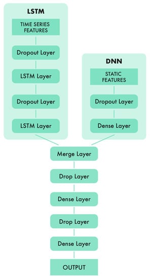 Neural network structure that provided the best results for the Test 2 dataset in the binary case (track 1). The left part is an LSTM network with the time-series data listed in Section 3.1 as input. The right part is a DNN that takes static features as input. The bottom part is a DNN which merges the outputs of these two networks and provides the final prediction result.
