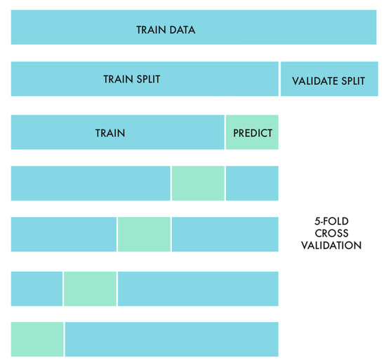 In both tracks, we performed five-fold cross-validation for model selection and performance evaluation. The k-fold cross-validation [43] method reduces bias—as most of the data is used for the fitting—and also variance—since training data are used as the validation set. This method provides a conservative estimate for the generalizability of the model [44]. We decided to use 5 folds, as shown in Figure 3, so that each of them was large and representative enough, also making sure that they had similar distributions of the target data.