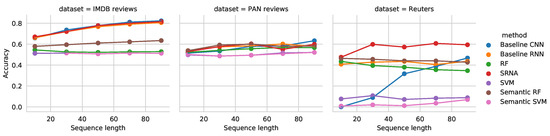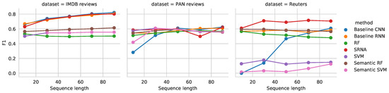 - Baseline CNN. The baseline neural networks used are a 1D convolutional neural network and a recurrent neural network with the same architecture as SRNA, where we omit the semantic part. Here, only word index vectors are used as inputs. The network was parameterized as follows. The number of filters was set to 64, the kernel size used was 5. The MaxPooling region was of size 5. The outputs of the pooling region were used as input to a dense layer with 48 neurons, followed by the final layer.