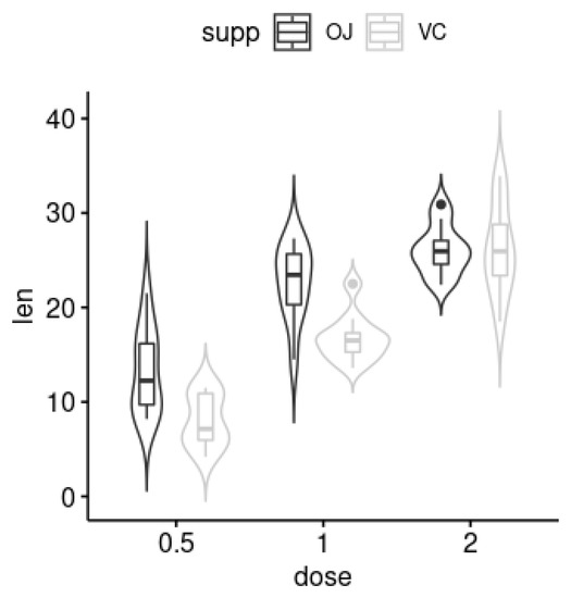 Figure 1 presents the violin plot [] for the ToothGrowth data set. According to the plot, there exists a different behavior of the response variable across the categorical regressors. Regardless of the supplementation method, there is a clearly observable trend of increased response with increasing dosage levels. Although there is a slight advantage in OJ being more effective than VC for obtaining greater response values, there is no significant statistical difference between supplementation methods, regardless of dose size.