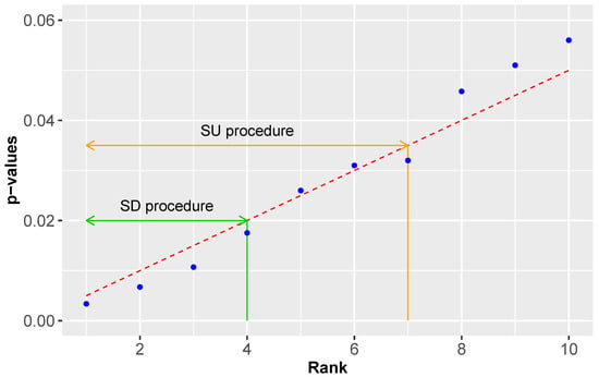In Figure 2 we visualize the working mechanism of a SD and a SU procedure. The dashed red line corresponds to the critical values and the blue points to rank ordered p-values. Whenever a p-value is below the dashed red line its corresponding null hypothesis is rejected, otherwise accepted. The green range indicates p-values identified with a SD procedure whereas the orange range indicates p-values identified with a SU procedure. As one can see, a SU procedure is less conservative than a SD procedure because it does not have the monotonicity requirement.