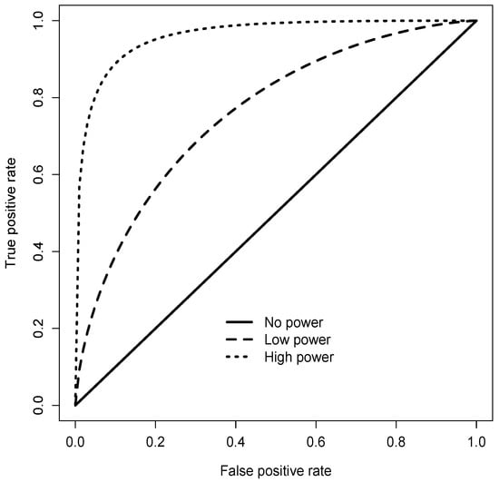 Choosing in one of the following simulation experiments reflects a situation where no accurate classifier can be found, as it is suggested by the fact that then the AUC (area under the curve) of the feature X taken as a soft classifier is (where denotes the standard normal distribution function). In the case , the same soft classifier X is very accurate with an AUC of . The different performance of the classifier depending on the value of parameter is also demonstrated in Figure 1 by the ROCs (receiver operating characteristics) corresponding to the two values (“low power”) and (“high power”).