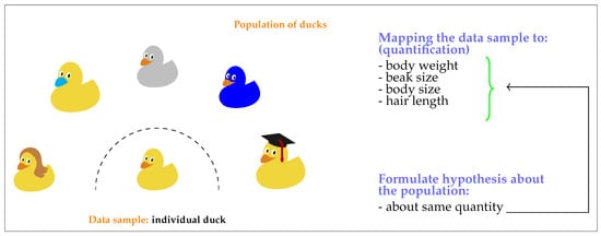 In Figure 1 we give an intuitive example for the basic idea of hypothesis testing. In this particular example the population consists of all ducks and the data sample is one individual duck randomly drawn from the entire population. In statistics ‘randomly drawn’ is referred to as ‘sampling’. In order to perform the comparison between the data sample and the population one needs to introduce a quantification of the situation. In our case this quantification consists in a mapping from a duck to a number. This number could correspond to, for example, the body weight, the beak size, the body size or the hair length of a duck. In statistics this mapping is called test statistic.